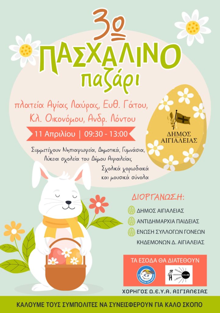 Ο Δήμος Αιγιαλείας σας προσκαλεί στο 3ο Πασχαλινό Παζάρι το οποίο θα πραγματοποιηθεί την Παρασκευή 11 Απριλίου, 09:30-13:00 στην Πλατεία Αγίας Λαύρας!