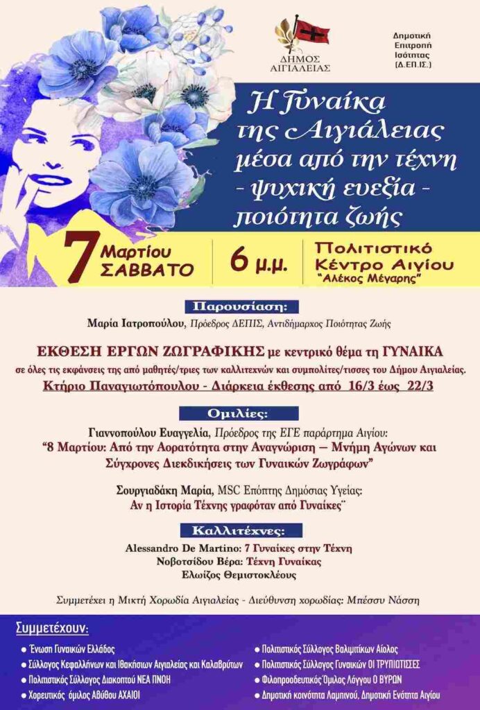 Το Σάββατο 7 Μαρτίου, στις 18:00, στο Πολιτιστικό Κέντρο Αιγίου «Αλέκος Μέγαρης», ο Δήμος Αιγιαλείας και η Δημοτική Επιτροπή Ισότητας παρουσιάζουν την εκδήλωση με τίτλο: