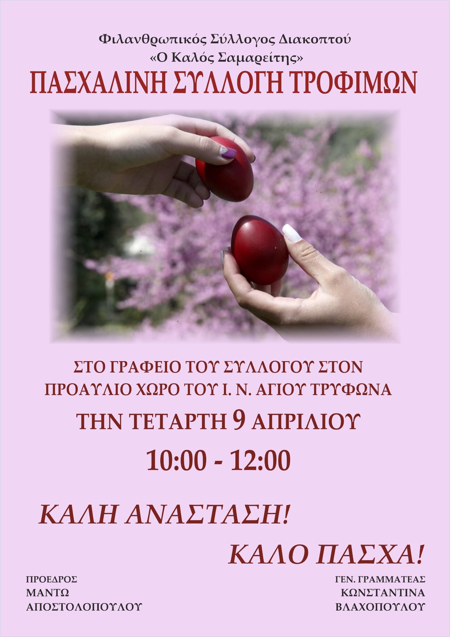 Ο φιλανθρωπικός σύλλογος Διακοπτού "Ο Καλός Σαμαρείτης" πραγματοποιεί και φέτος Πασχαλινή συλλογή τροφίμων για τους ευάλωτους συνανθρώπους μας. Την Τετάρτη 9 Απριλίου και ώρα 10:00-12:00 στο γραφείο του συλλόγου στον προαύλιο χώρο του Ιερού ναού Αγίου Τρύφωνα Διακοπτού. Φέτος όλοι μπορούμε να κάνουμε την διαφορά! Η τροφή δίνει ζωή, και η καλοσύνη θρέφει την ψυχή!Συλλέγονται:Τρόφιμα...